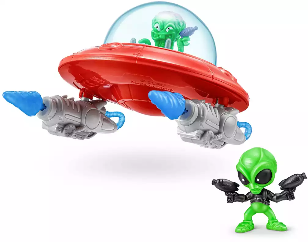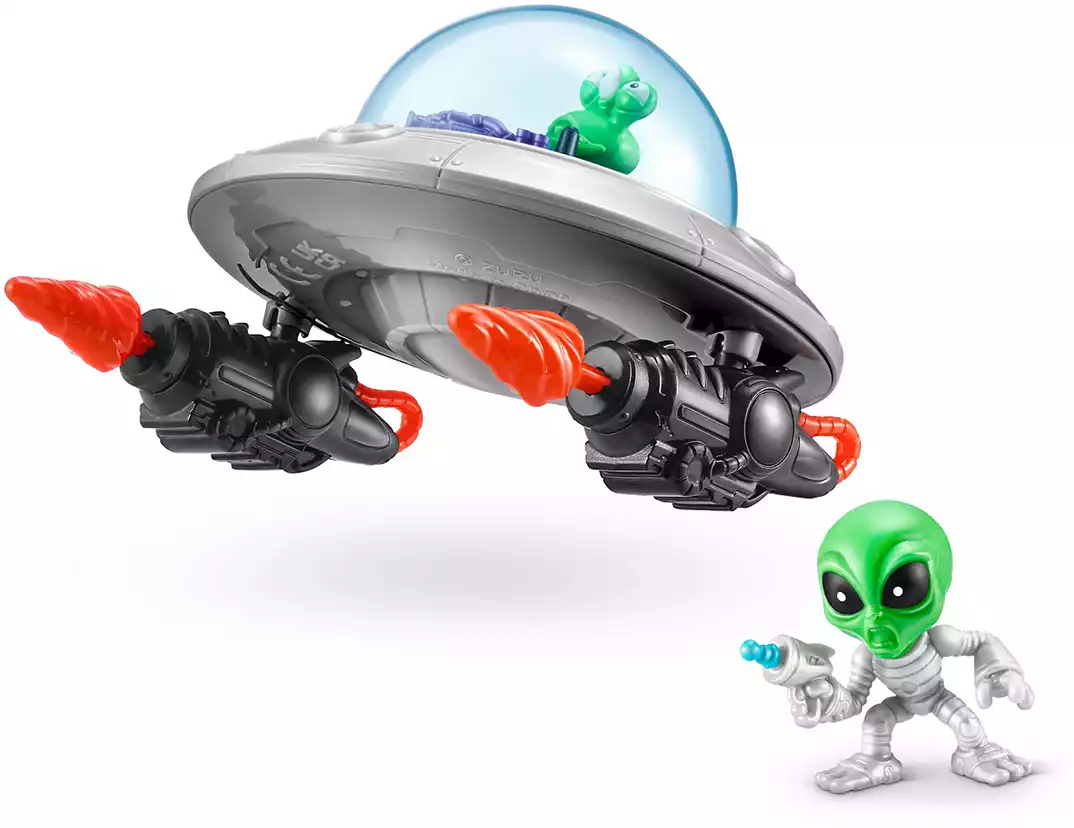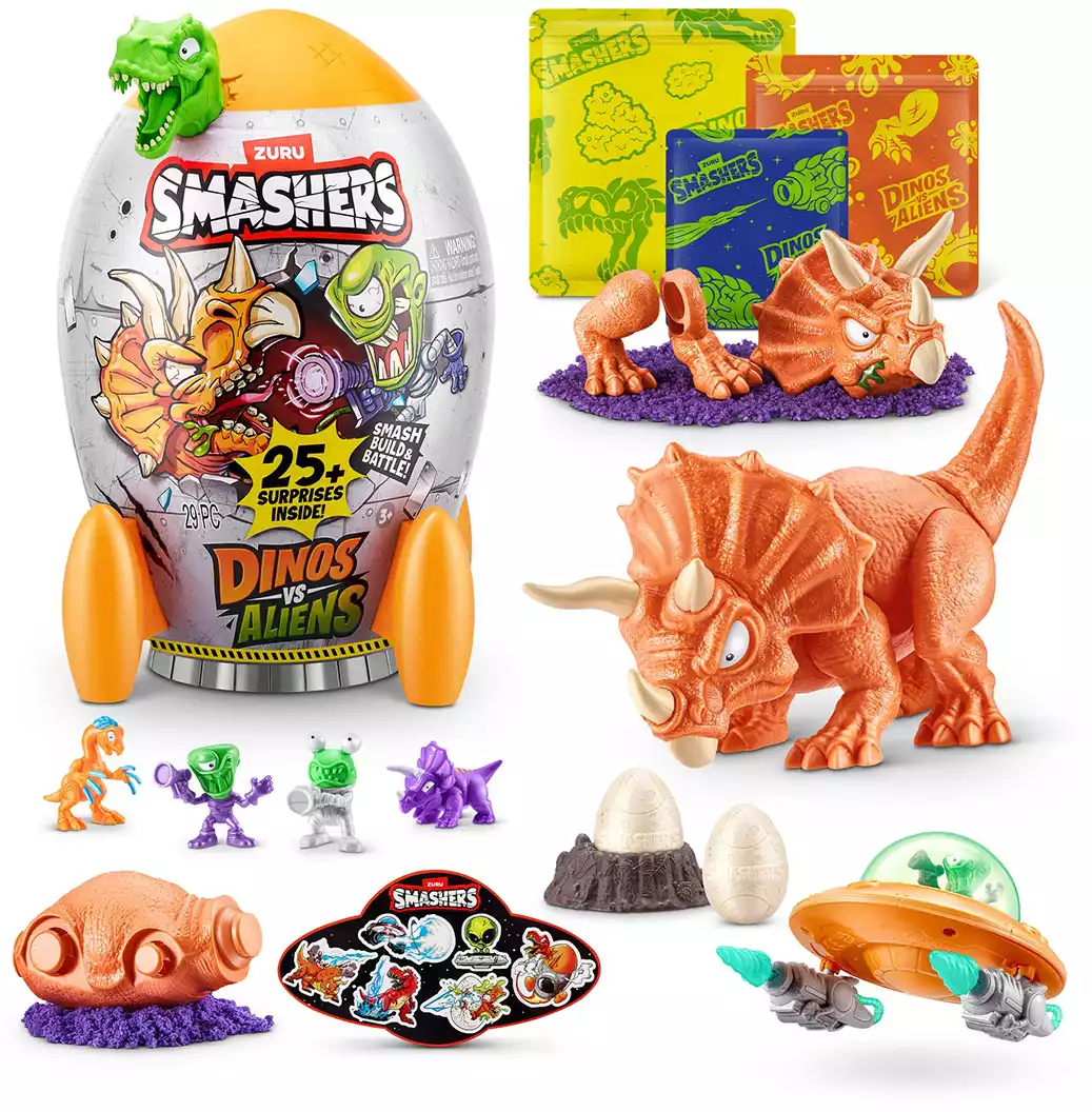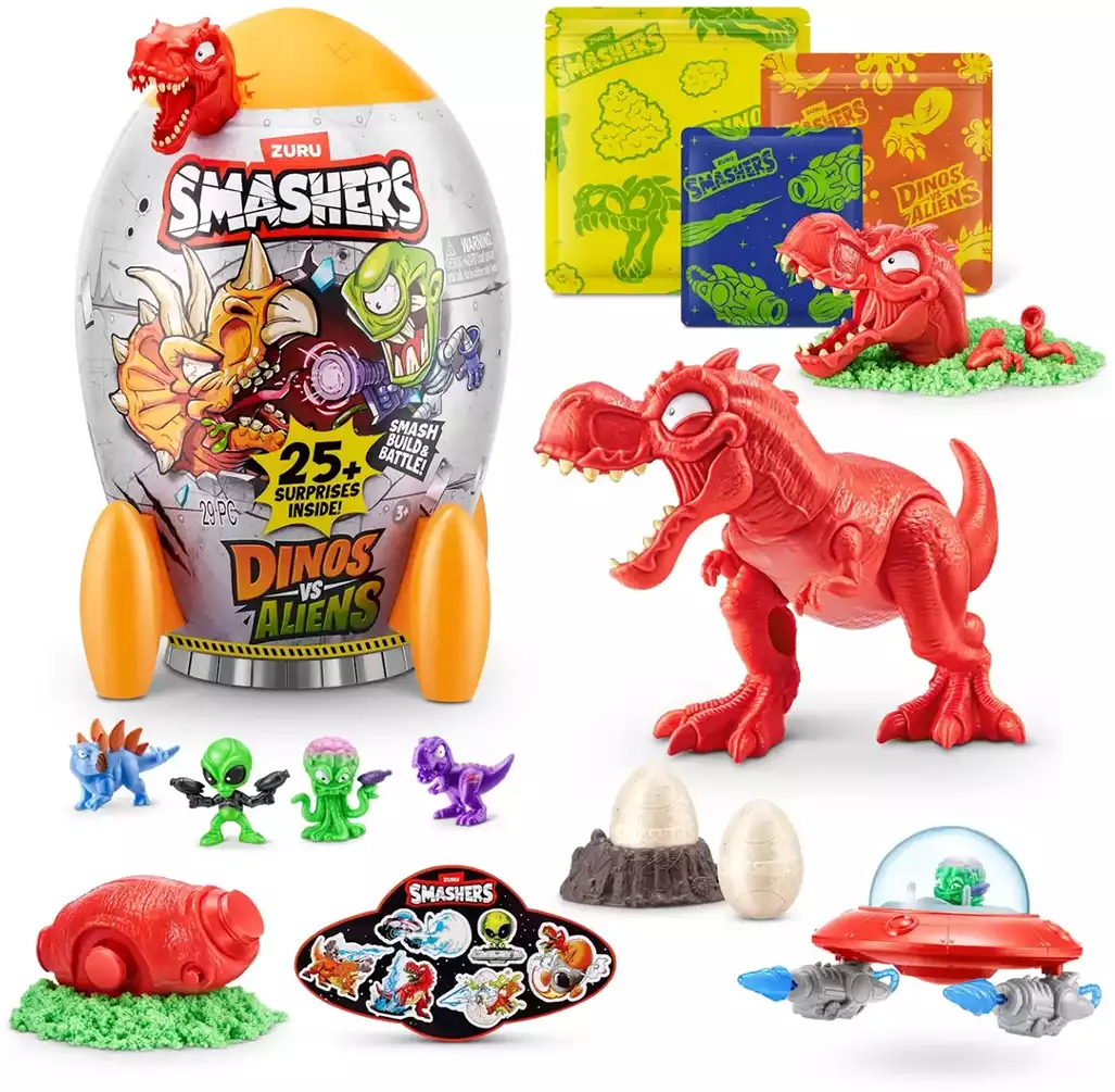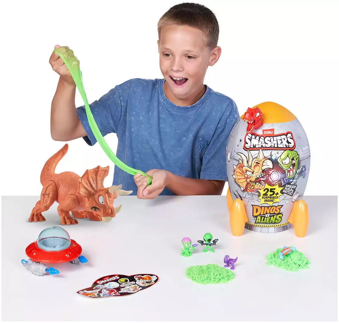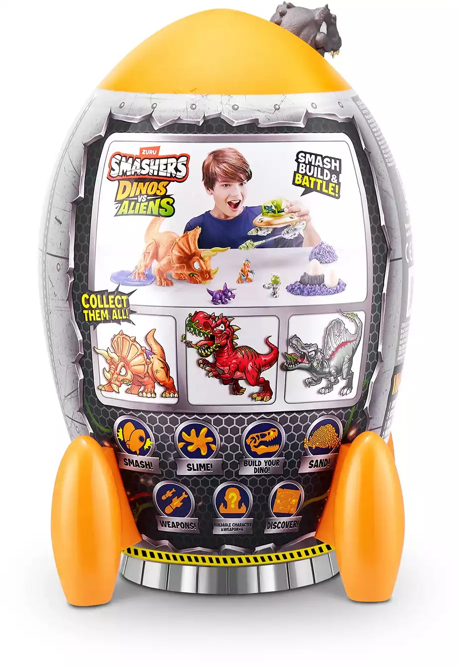 Детская игрушка набор животных Zuru Smashers Динозавр против пришельцев — это захватывающее приключение для мальчиков, где динозавры сталкиваются с пришельцами в космической битве. Внутри космической капсулы находится более 25 сюрпризов, включая части динозавра и инопланетян. Ребенок сможет собрать собственного динозавра и разыграть уникальные боевые сцены с пришельцами. Благодаря фантазии, дети решат, кто победит в межгалактической битве и придумают множество сценариев для игры!