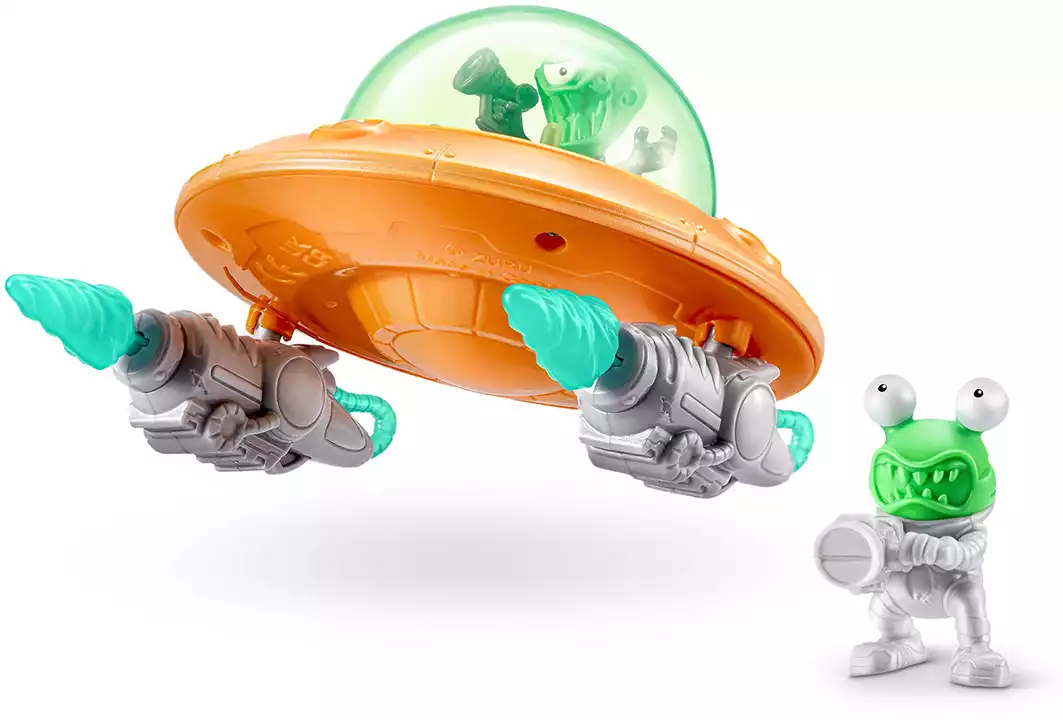 В комплект входят: 1 ракета, 3 части дино для сборки, 1 НЛО корабль, 2 оружия, 2 огнестрельные ракеты для корабля, 2 пришельца, 2 мини яйца, 2 секретных персонажа, 2 упаковки слайма, 1 упаковка песка, 7 стикеров, 1 карта сокровищ, 1 гид коллекционера