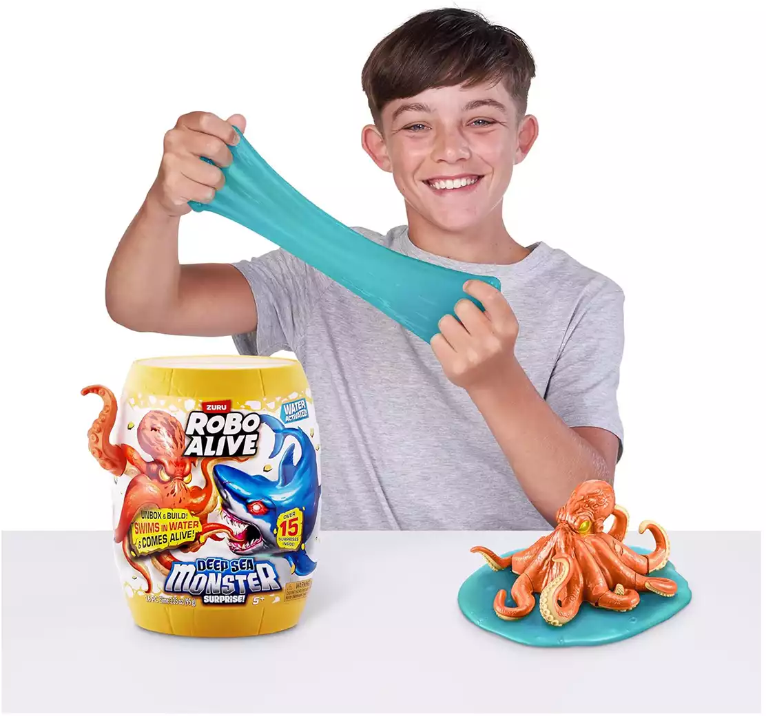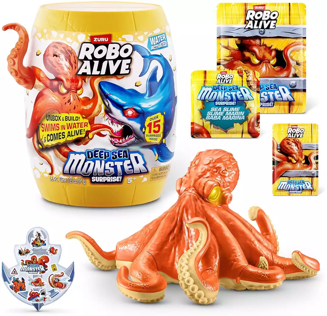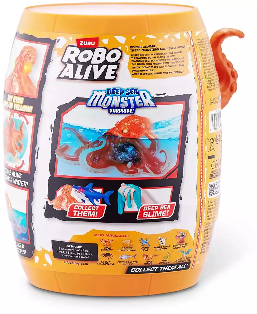 Погрузитесь в захватывающий мир глубоководных приключений с инновационным набором Zuru Robo Alive Deep Sea Monster Surprise (71155). Идеально подходит для юных исследователей от 5 лет и старше, которые стремятся к приключениям и новым открытиям. Путешествие начинается с распаковки таинственного бочонка, выполненного в ярком дизайне с изображением морского чудовища. Необходимо открыть бочку и исследовать её отсеки, чтобы найти более 20 сюрпризов: от слайма до осьминога. Внутри скрывается осьминог — существо оживает при контакте с водой, превращая игру в настоящее приключение.