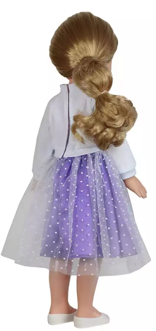- В комплект одежды куклы входит: свитшот, юбка, трусики, балетки.